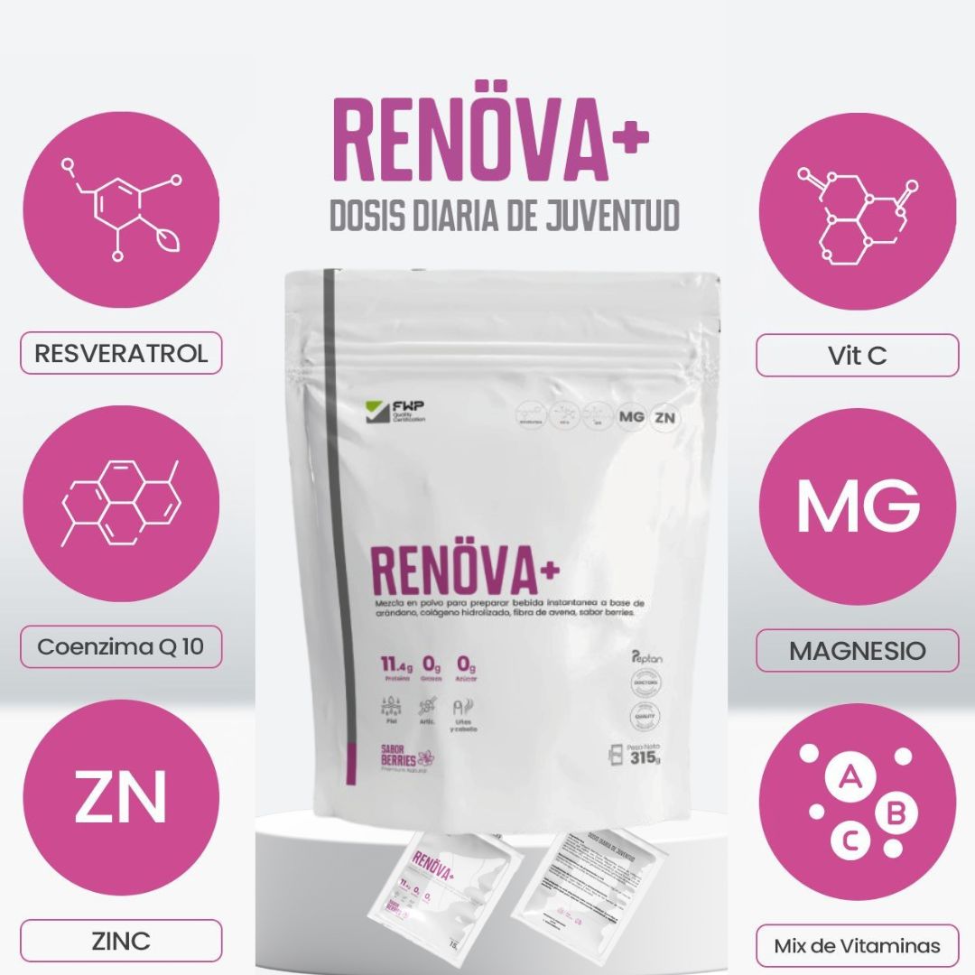 Transforma tu rutina diaria con RENÖVA+, el suplemento que combina colágeno hidrolizado, Resveratrol y Coenzima Q10 para ofrecerte una dosis de juventud y salud.